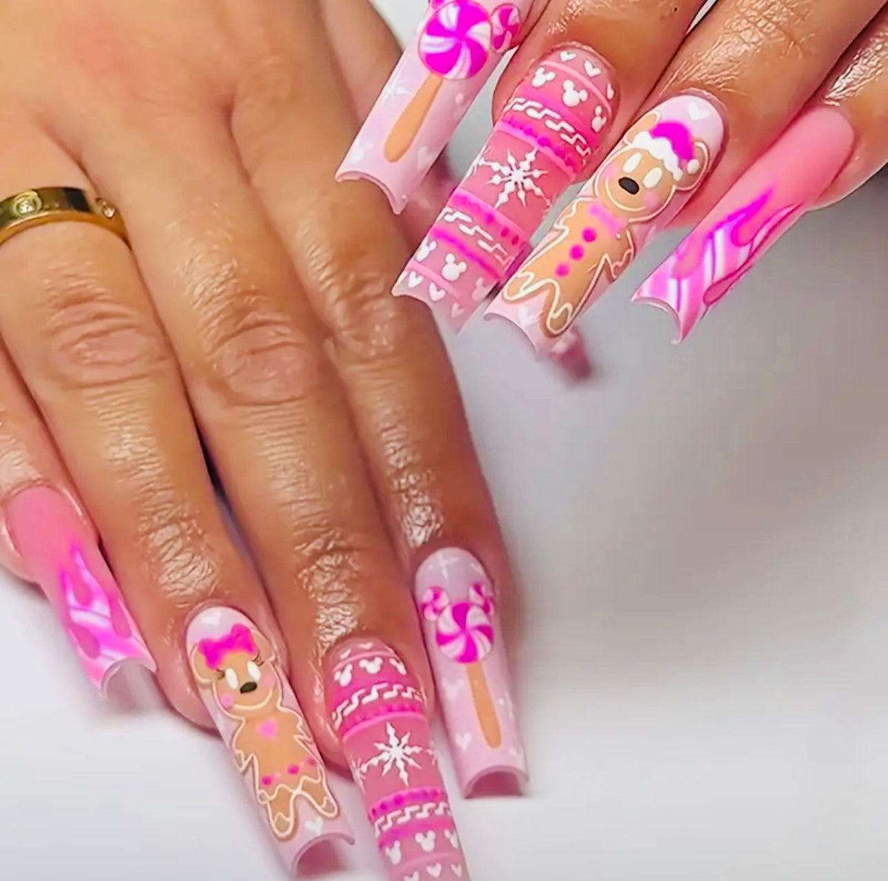 Christmas Pink with Gingerbread and Lollipop Designs Long Press On Nails