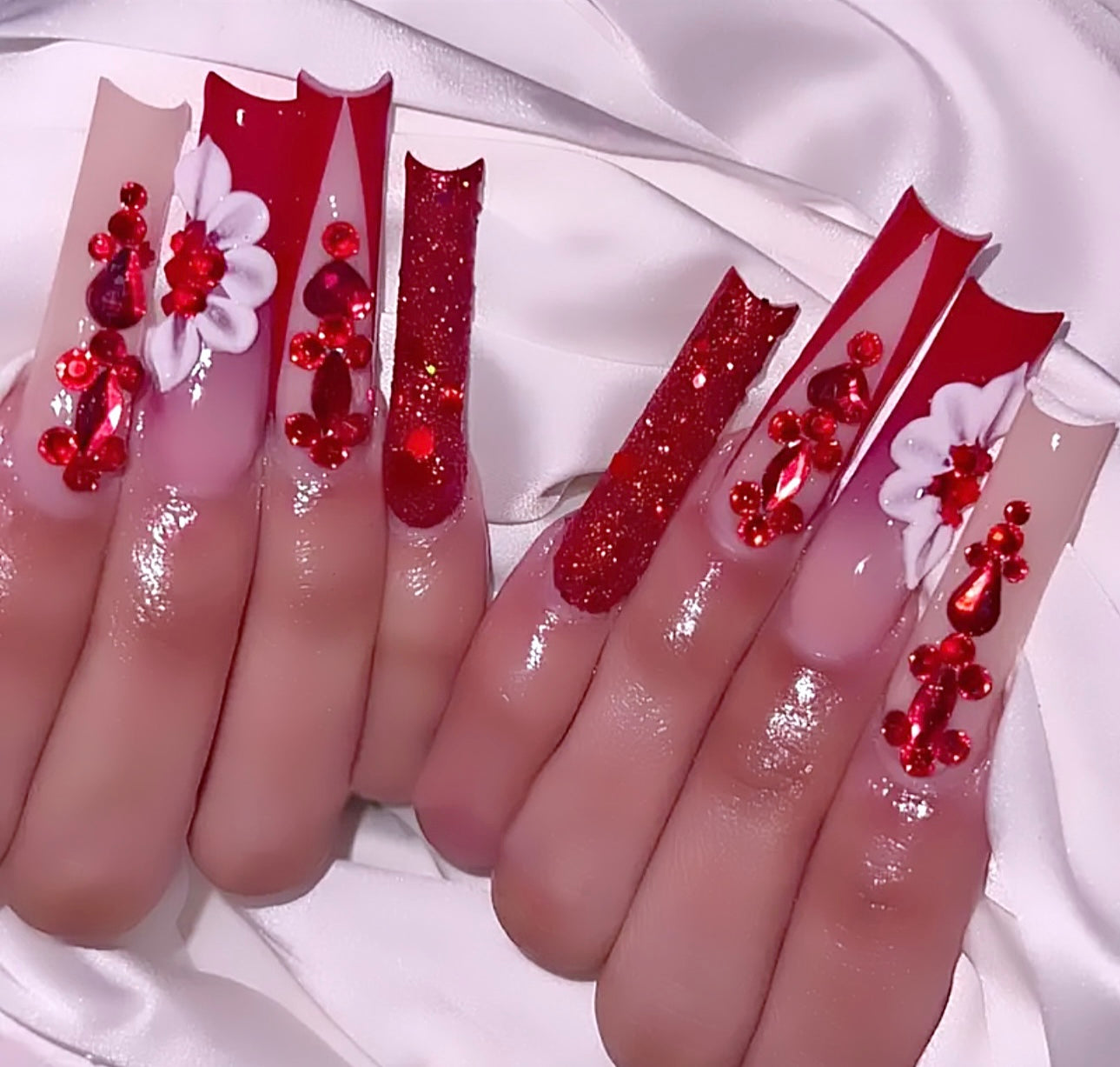 Red Flower Patterns and Glitter Accents Long Press On Nails