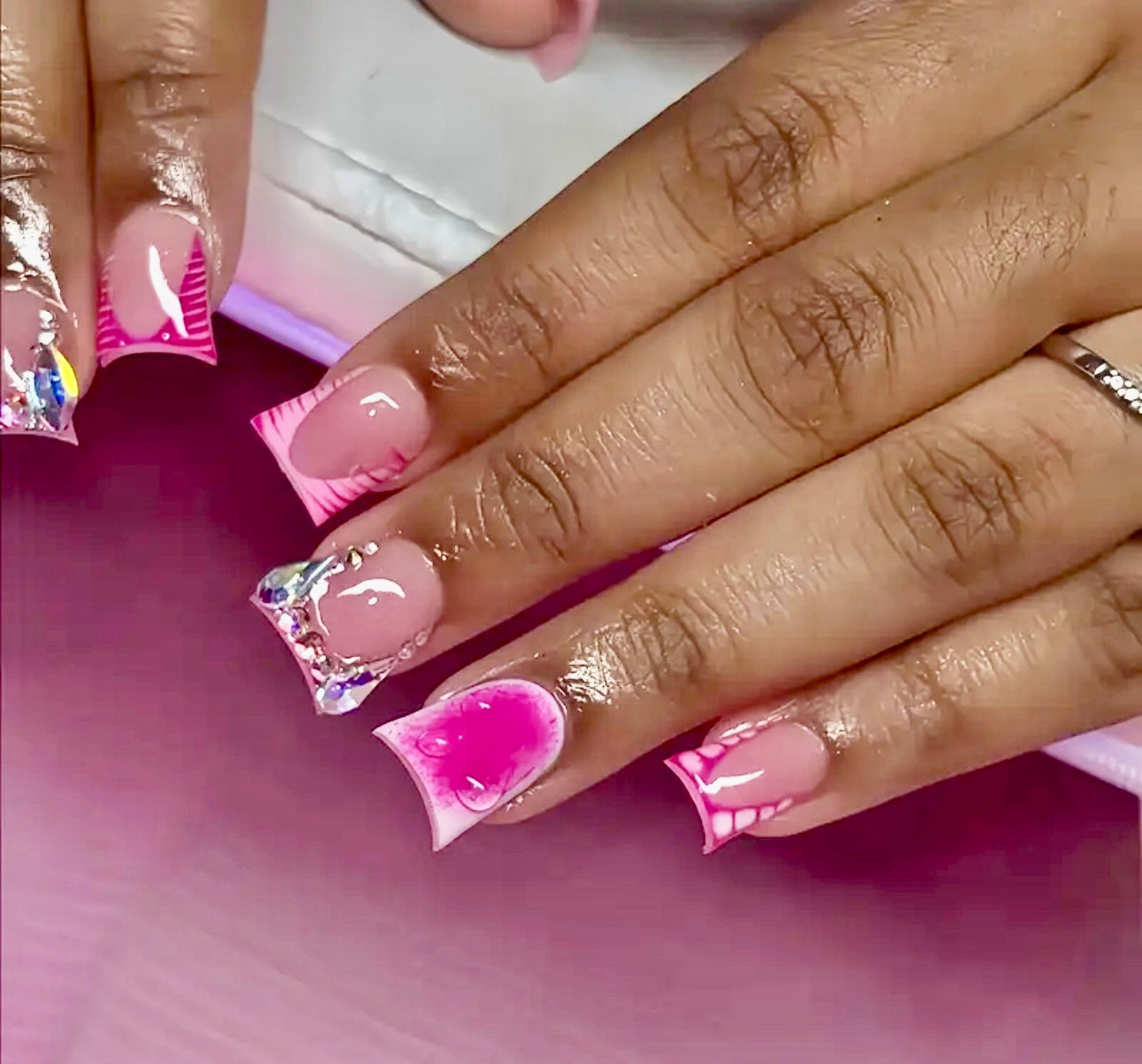 Pink Stripe Designs and Rhinestones Short Duck Press On Nails