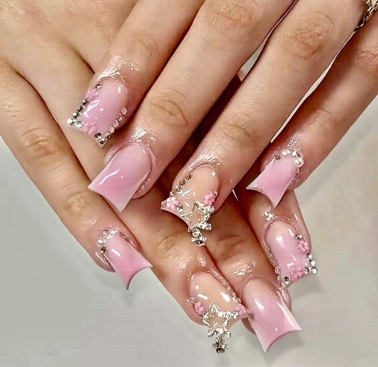 Soft Pink French Tips with Rhinestones and Star Charms Short Press On Nails
